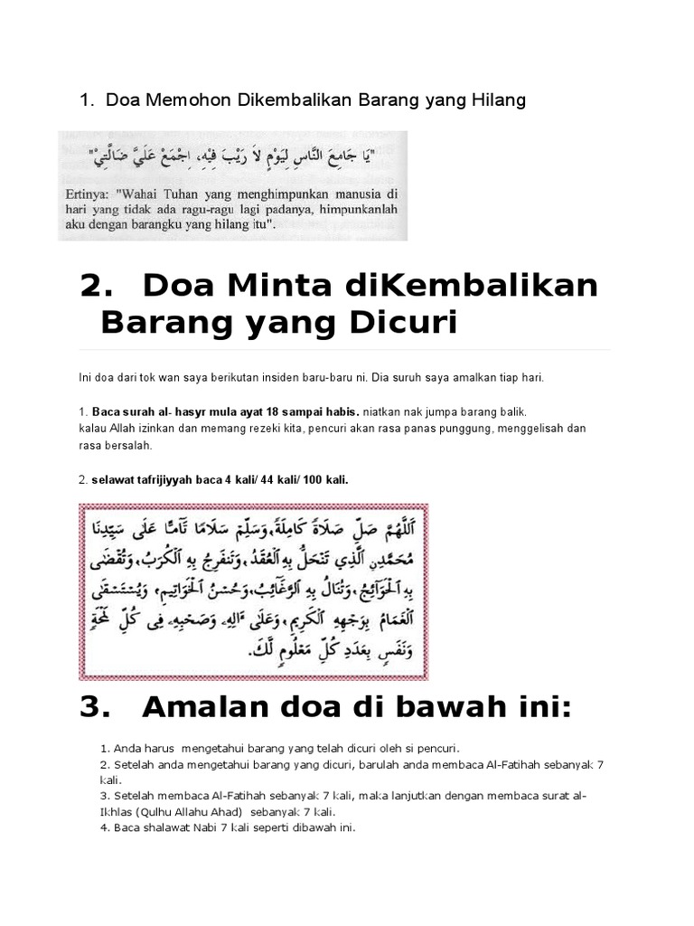 Anda bisa mengamalkan bacaan doa untuk memohon agar barang yang hilang bisa ditemukan kembali. Ya allah, wahai tuhan yang mengembalikan barang yang hilang, wahai yang memberi petunjuk dari kesesatan, wahai yang menghimpunkan manusia pada hari yang tidak ada keraguan padanya, himpunkanlah. Padahal ada allah tempat kita mengadukan. Tentunya kita berharap barang penting yang hilang itu bisa ditemukan lagi. Entah hilang karena lupa atau mungkin hilang karena dicuri.